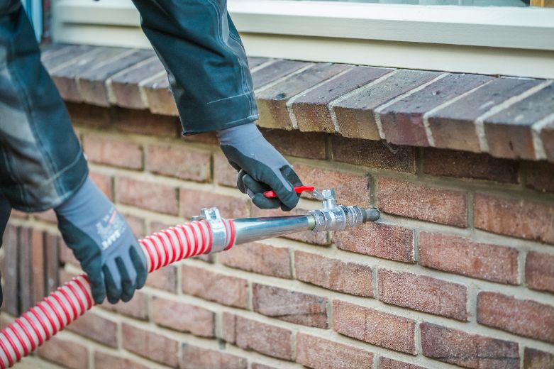 Wanneer de spouw volledig is gevuld dan worden de gaten weer netjes dichtgemaakt met specie in dezelfde kleur als de voegen. De rommel wordt opgeruimd en alles wordt meegenomen.